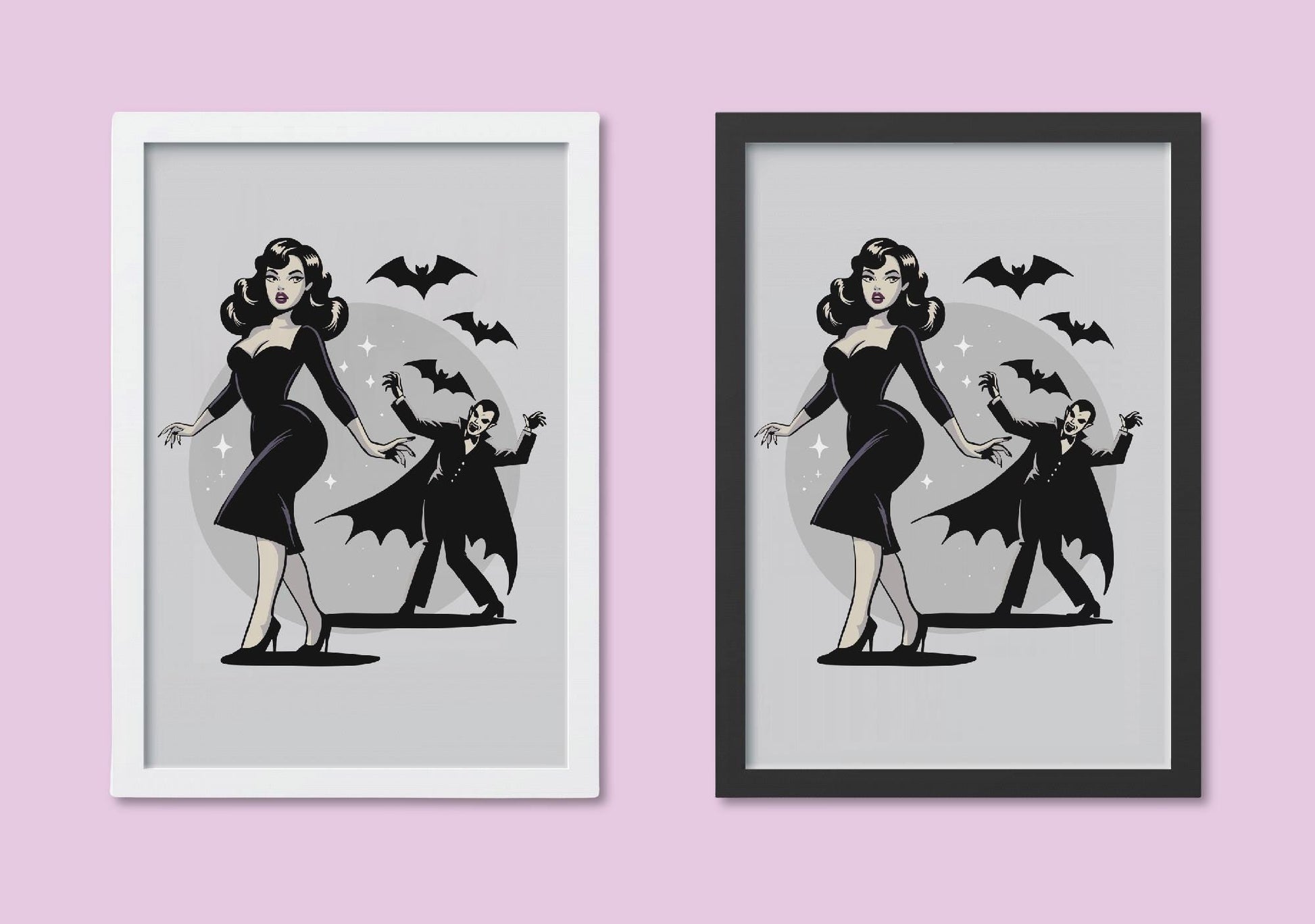 Step into a scene straight out of a classic B-movie with this A4 art print featuring a glamorous pinup girl being pursued by a mysterious vampire. This striking illustration channels the campy drama of vintage horror cinema with a playful twist, making it the perfect addition to your collection of retro-inspired decor. With bold colours and dramatic composition, it’s a tribute to both mid-century pinup glamour and spine-tingling gothic charm. Ideal for women who adore vintage pinup aesthetics, retro fashion, or alternative styles, this artwork makes a fantastic gift or a unique statement piece for your walls.