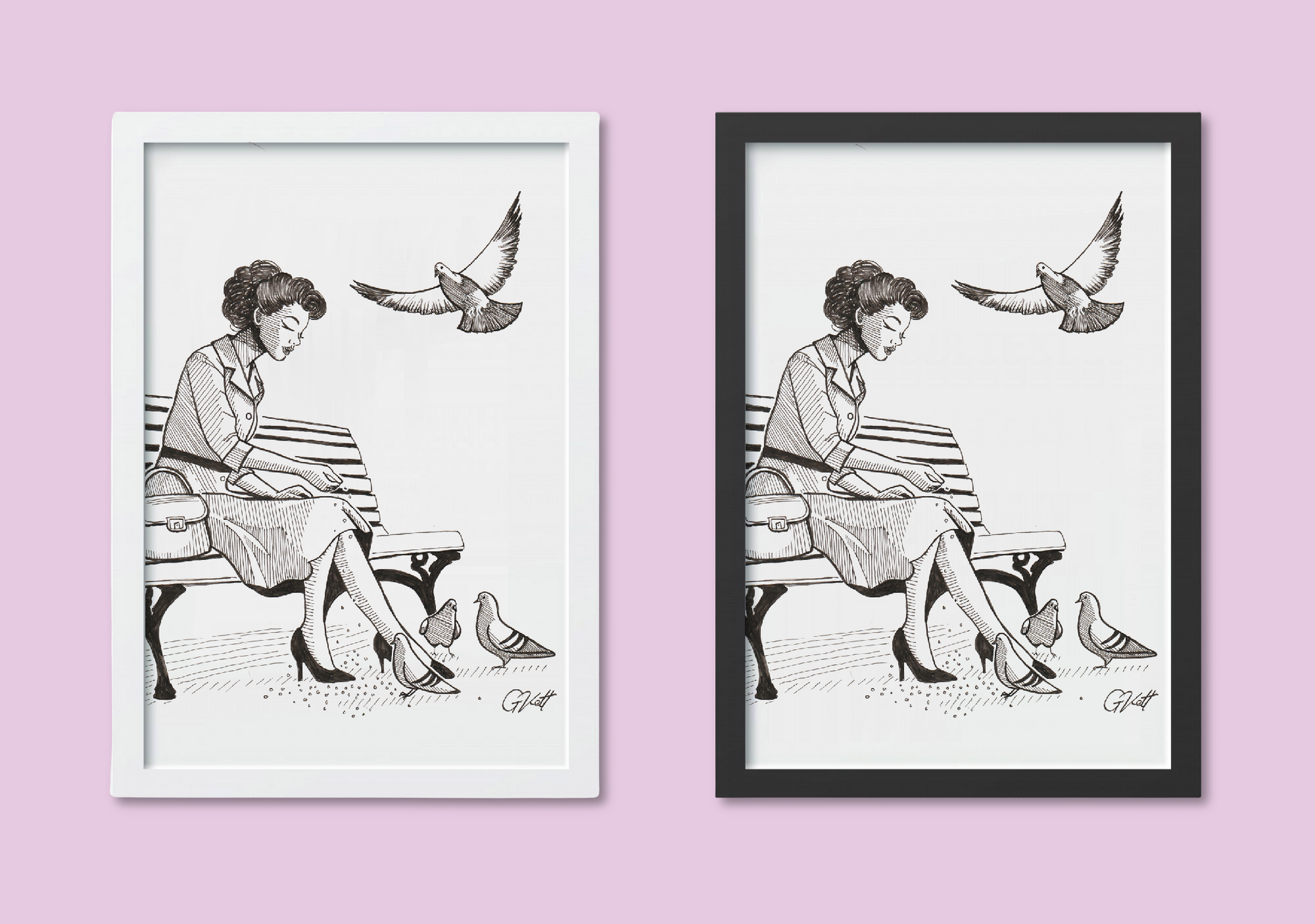 Not all stories need a grand plot twist — some unfold gently in the hush of a quiet afternoon. Feathered Company is a hand-drawn black and white art print that captures one of those still, unspoken moments. A 1940s-inspired woman sits gracefully on a park bench, surrounded by the soft rustle of pigeons and the poetry of the present.