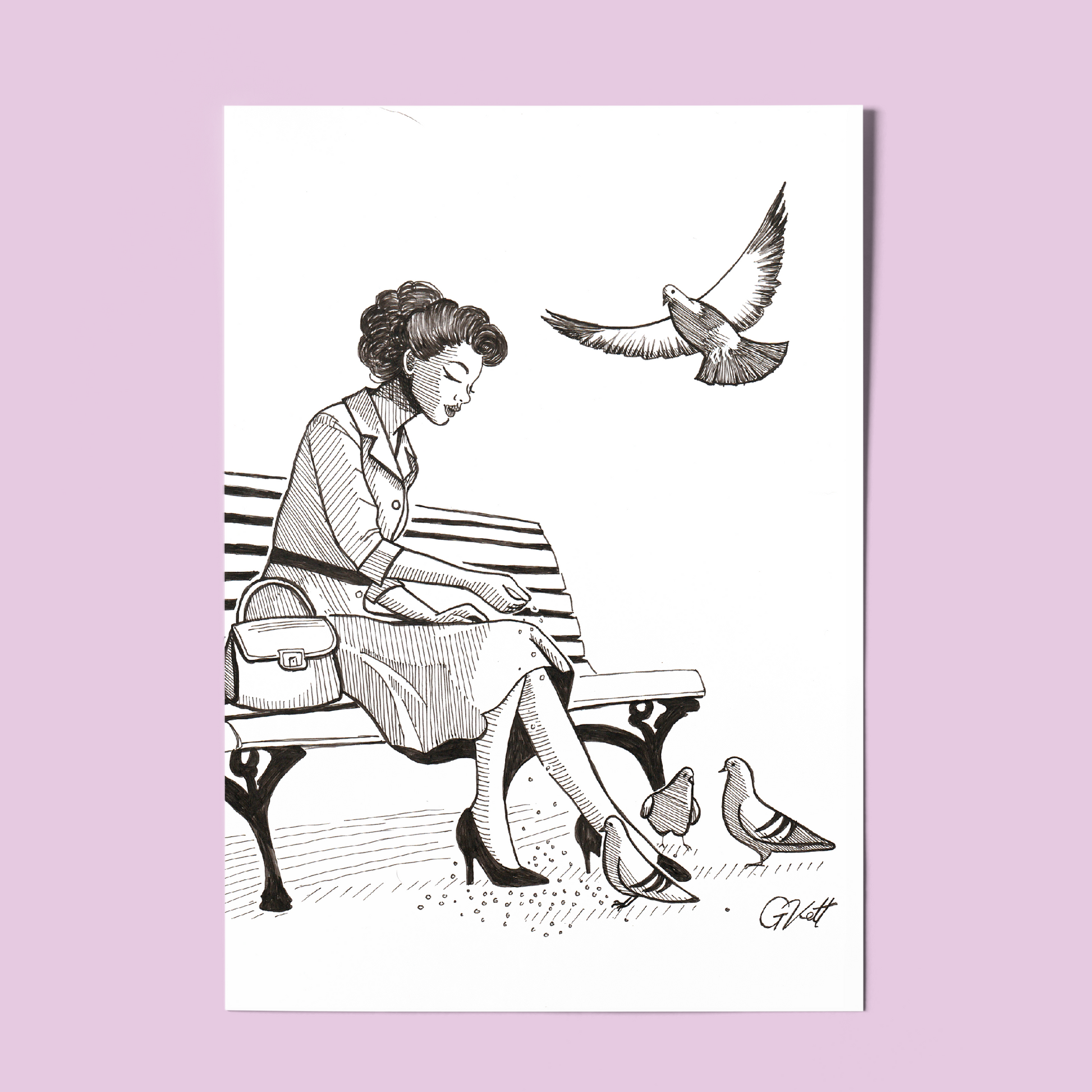 Drawn in delicate pen and ink on smooth Bristol board using Sakura Micron and Tombow brush pens, this piece is a love letter to vintage femininity, mindful solitude, and the quiet magic found in everyday acts of tenderness. Her timeless silhouette, thoughtful gaze, and feathered companions conjure a sense of calm — a reminder to slow down and savour life’s simpler chapters.