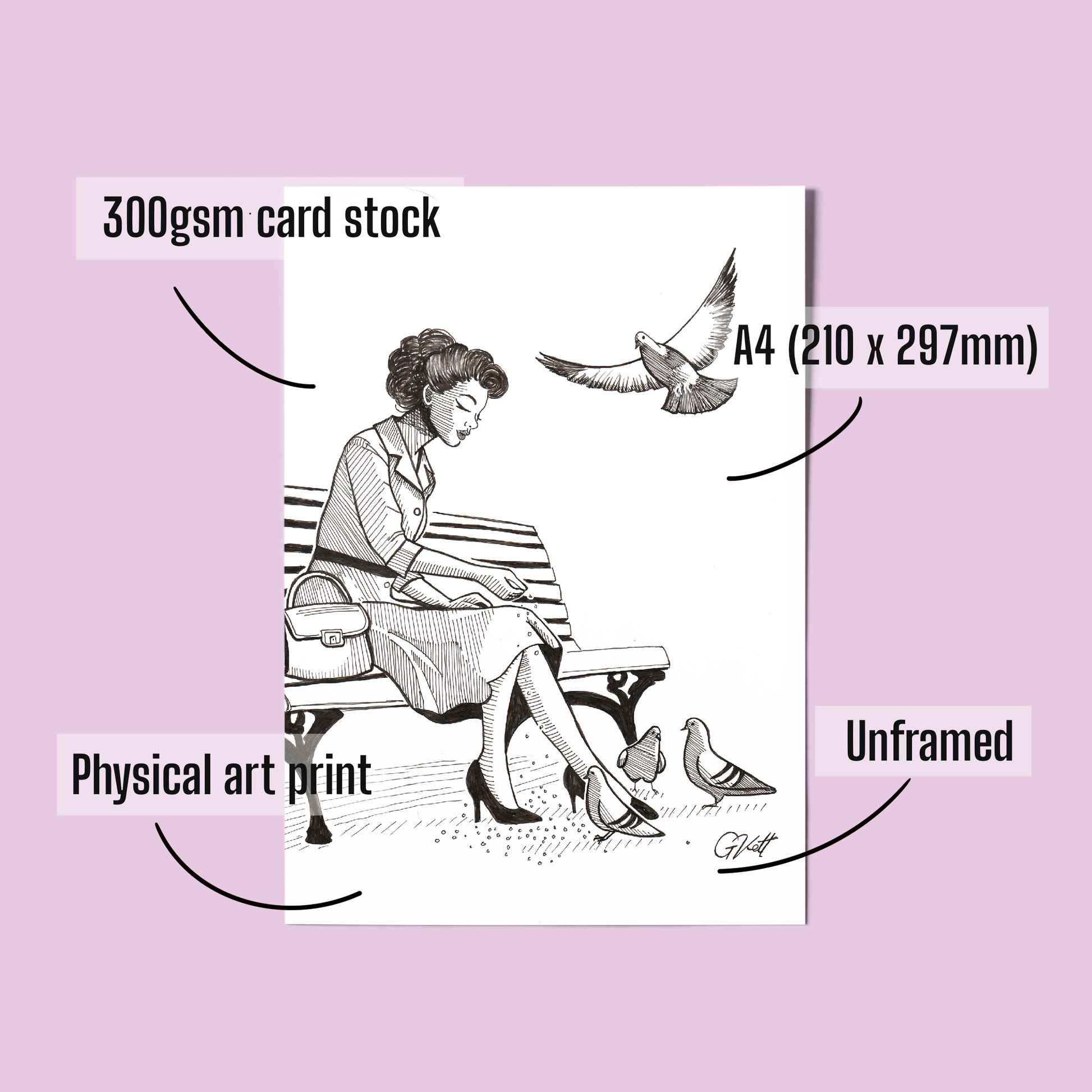 “Feathered Company” – A4 Black and White Vintage-Inspired Art Print of a Woman Feeding Pigeons