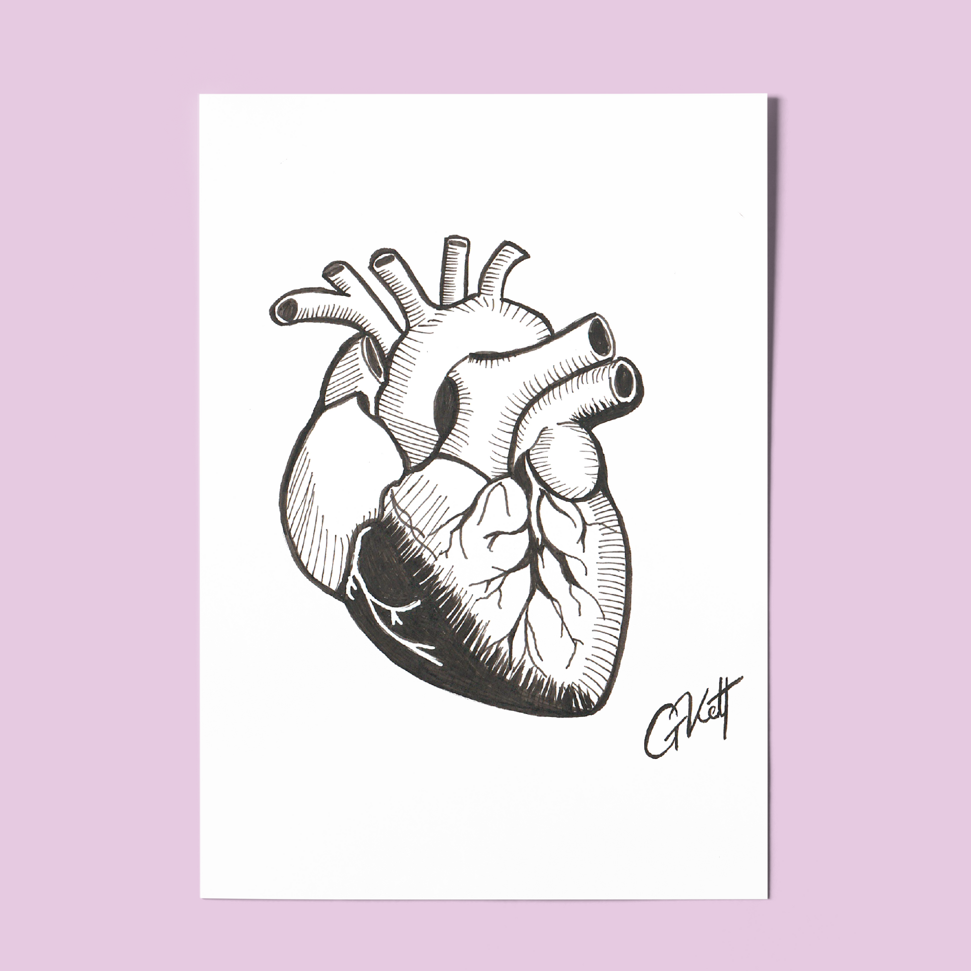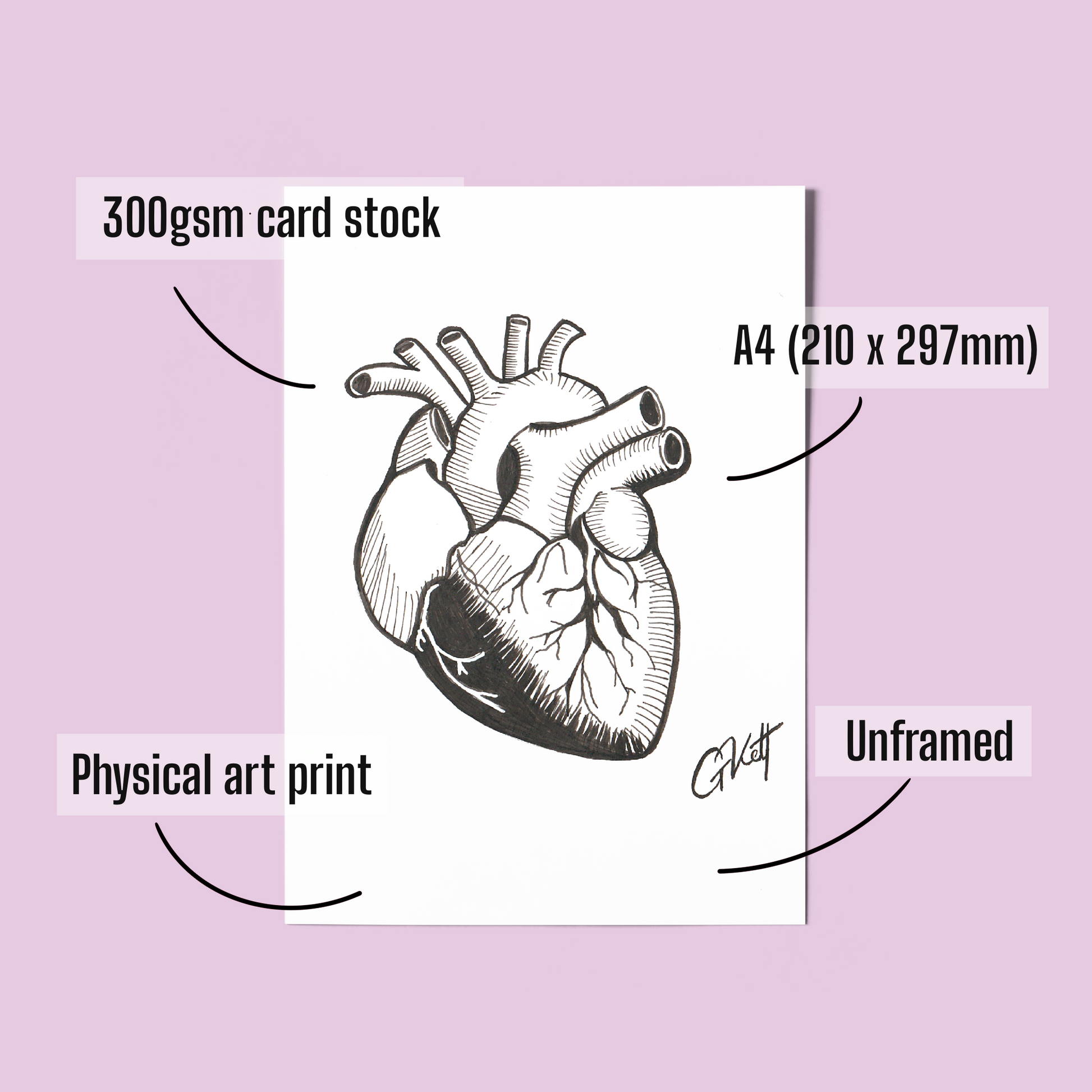 Anatomical Heart A4 Art Print – Hand Drawn Pen and Ink Illustration with Whimsical, Emotive Detail