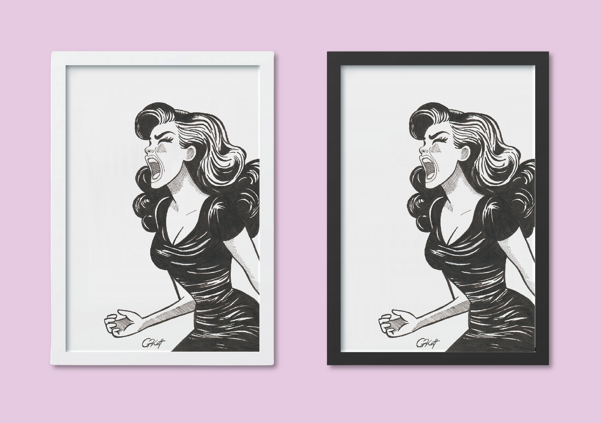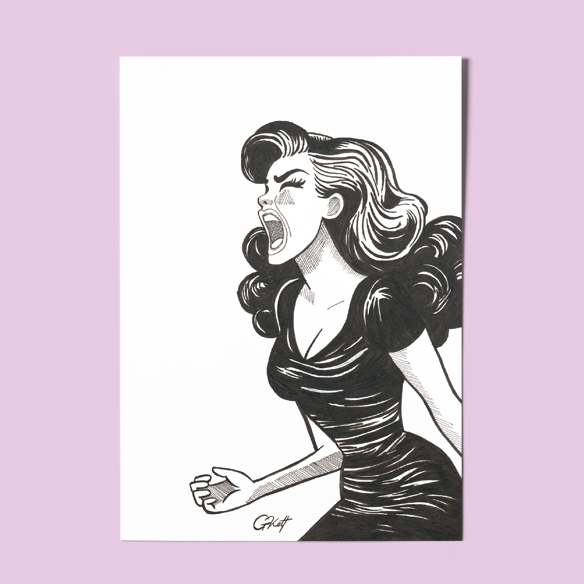 Rendered with precision using Sakura Micron pens for the fine detail, and a Tombow Fudenosuke brush pen to pour fire into every stroke, she’s both gorgeous and gloriously fed up. This is more than art, it’s an exhale. It’s a rallying cry. It’s that moment of feminine rage you feel in your bones.