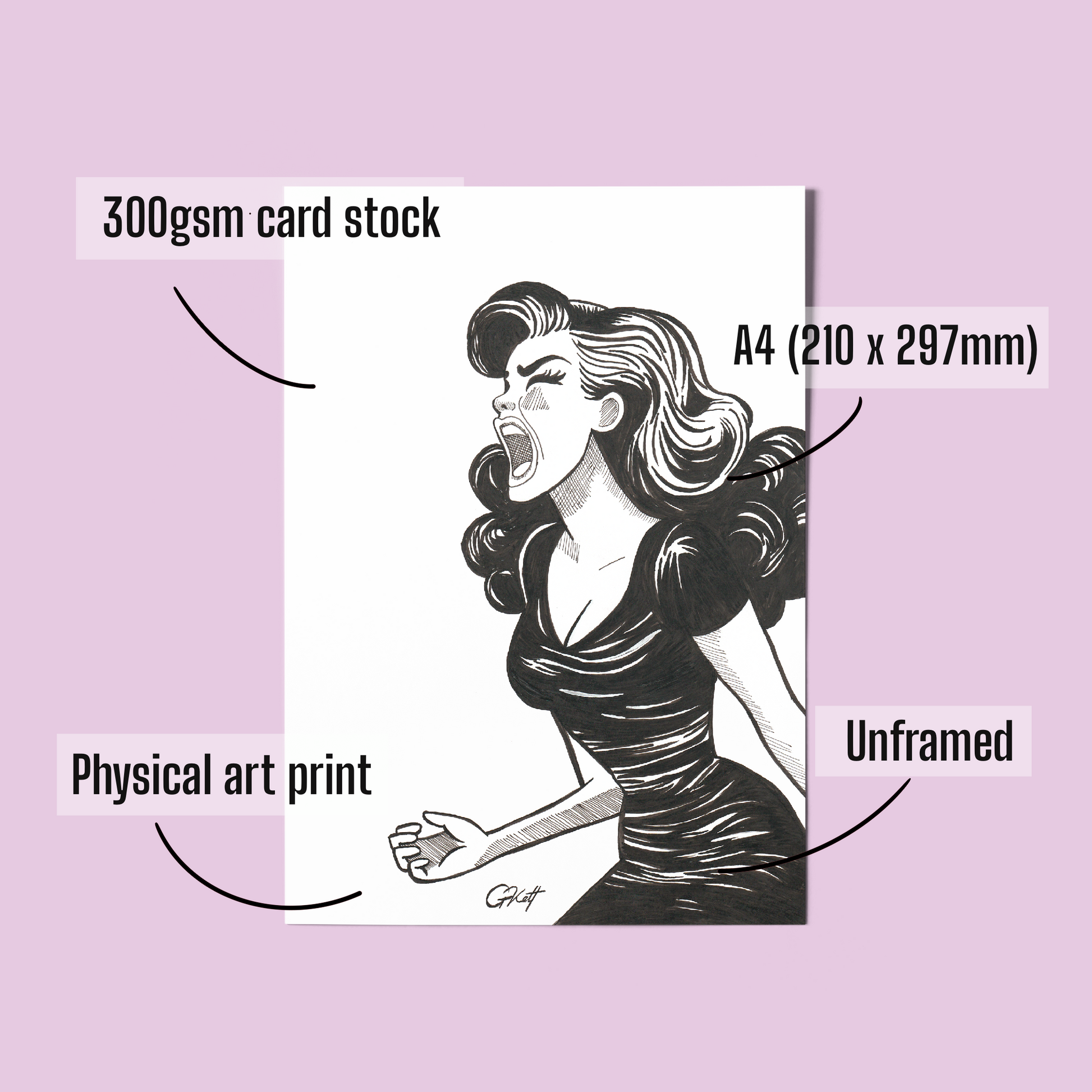 "Female Rage" – A4 Hand Drawn Pen and Ink Art Print | Bold Illustration of Feminine Fury and Power