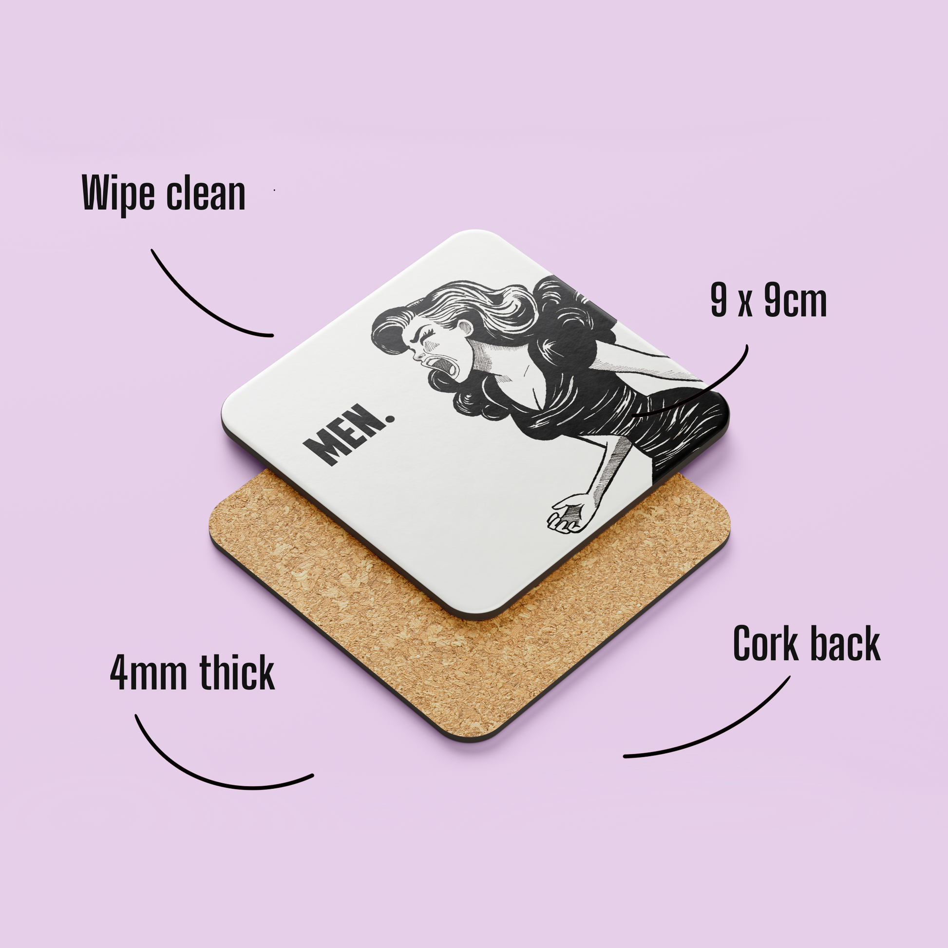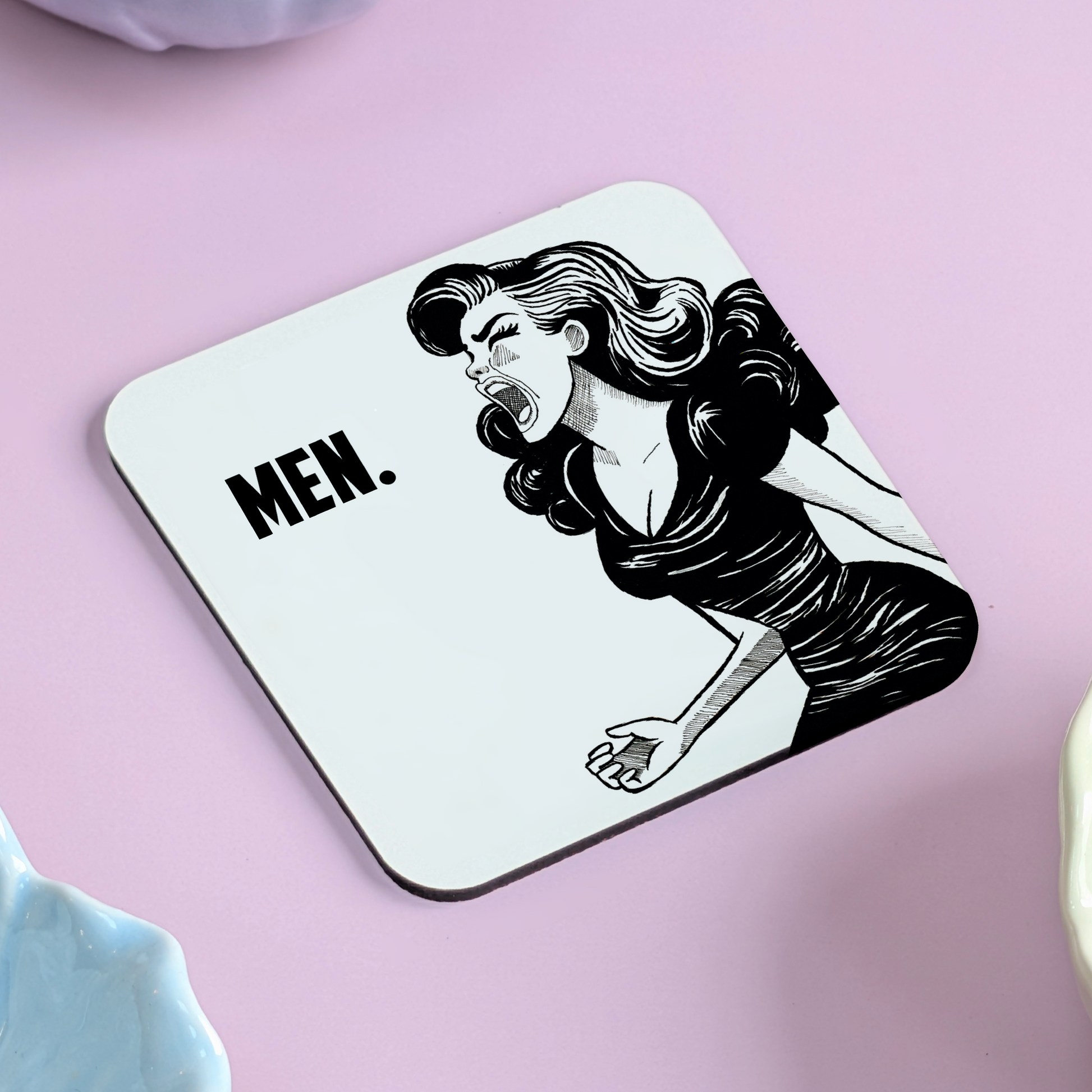 Female Rage "Men" Coaster – Hand Drawn Illustration of Female Rage with Clenched Fists and Scream Expression