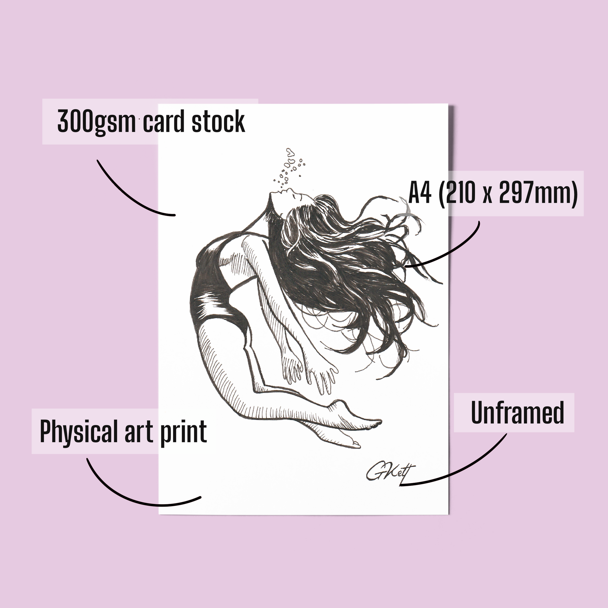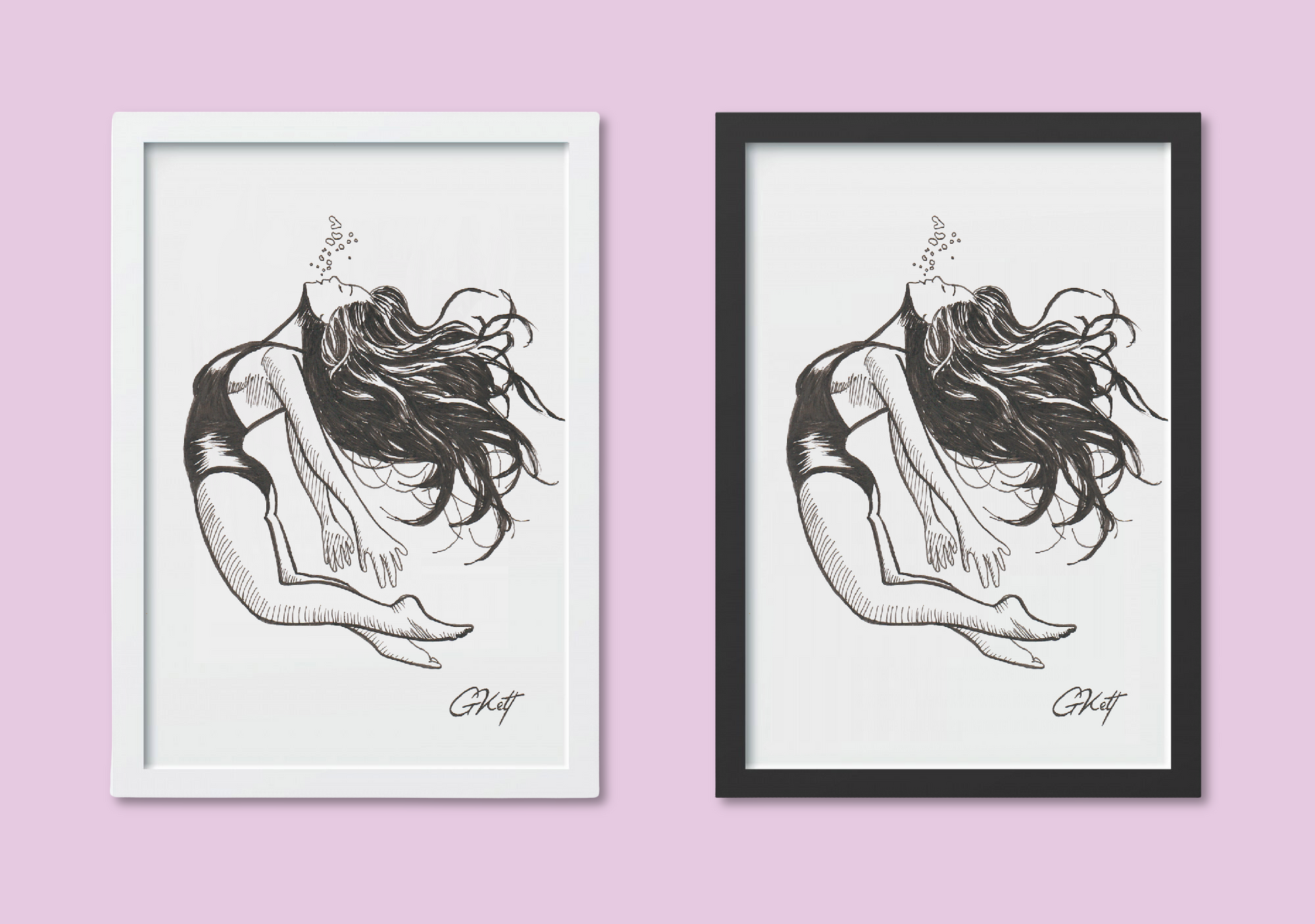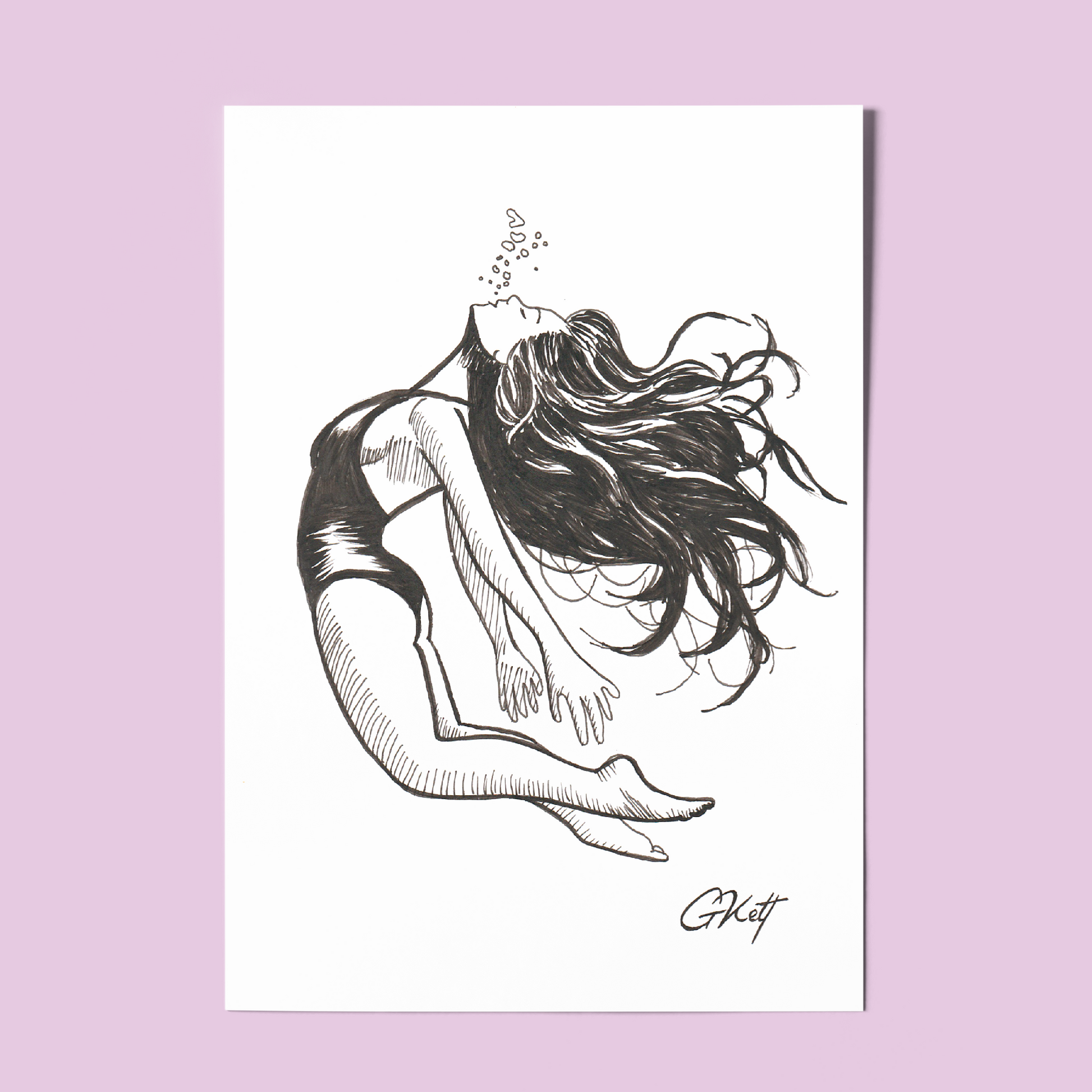 Drift into a dreamlike moment beneath the surface with this delicate A4 art print, capturing the quiet stillness of a woman suspended underwater. Hand drawn in fine pen and ink, this elegant illustration evokes both calm and emotion — a peaceful surrender to the weightless world below, where time slows and thoughts soften into silence.