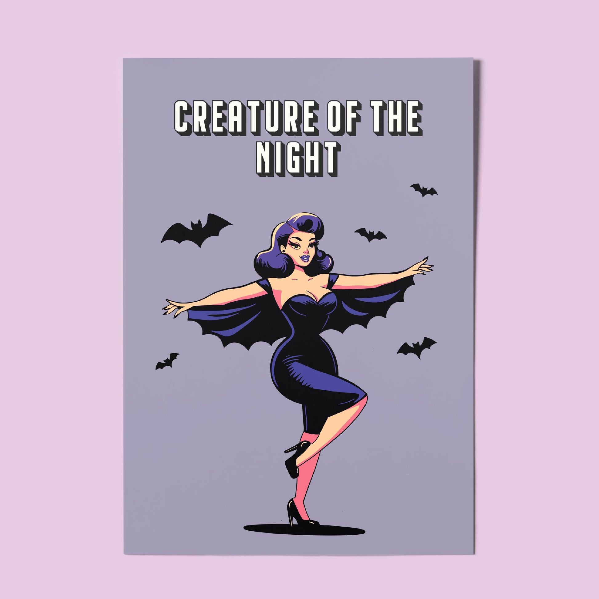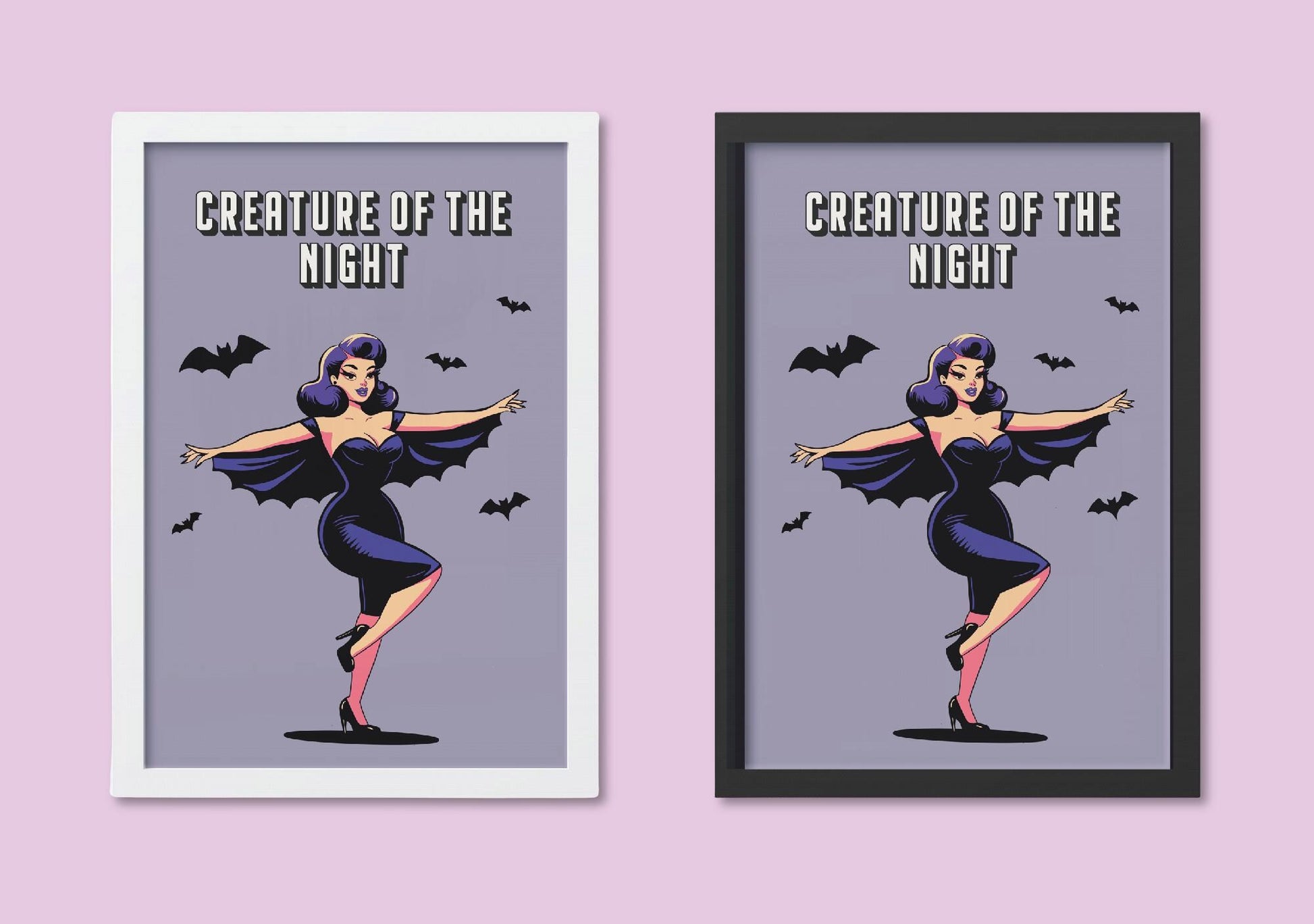 Celebrate your dark and daring side with this stunning A4 art print featuring a vintage-inspired pinup beauty with bat wings, surrounded by a fluttering of bats. Topped off with the bold text "Creature of the Night," this design perfectly blends retro glamour with gothic allure. Ideal for adding a touch of moody elegance to your home, this print is perfect for women who embrace vintage pinup aesthetics, retro fashion, or alternative styles. Whether you're a fan of rockabilly culture, a lover of all things spooky, or just want a striking piece of wall art to reflect your unique personality, this print is a must-have addition to your decor.