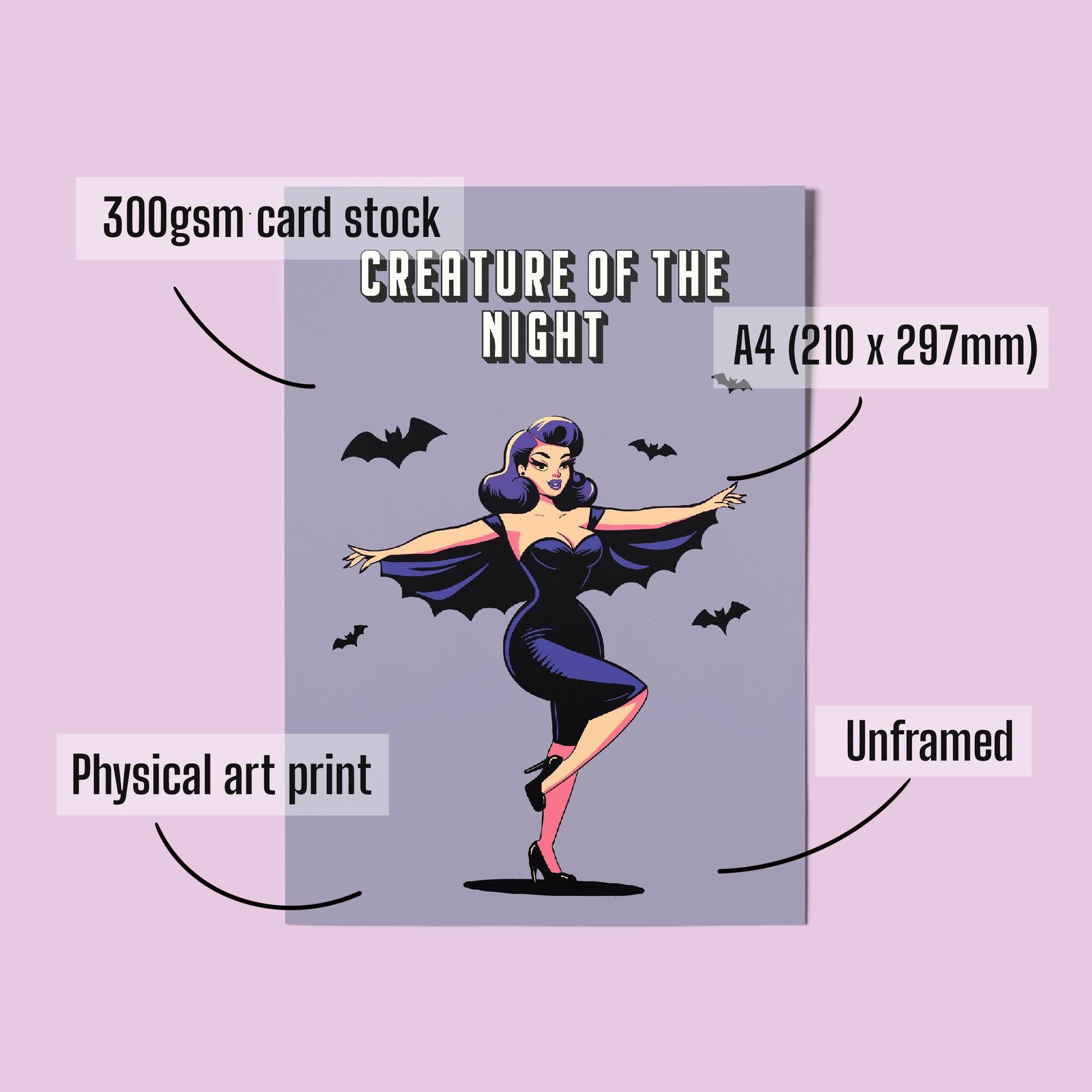 Gothic Pinup A4 Art Print “Creature of the night” – Alt Vintage Pinup Wall Art