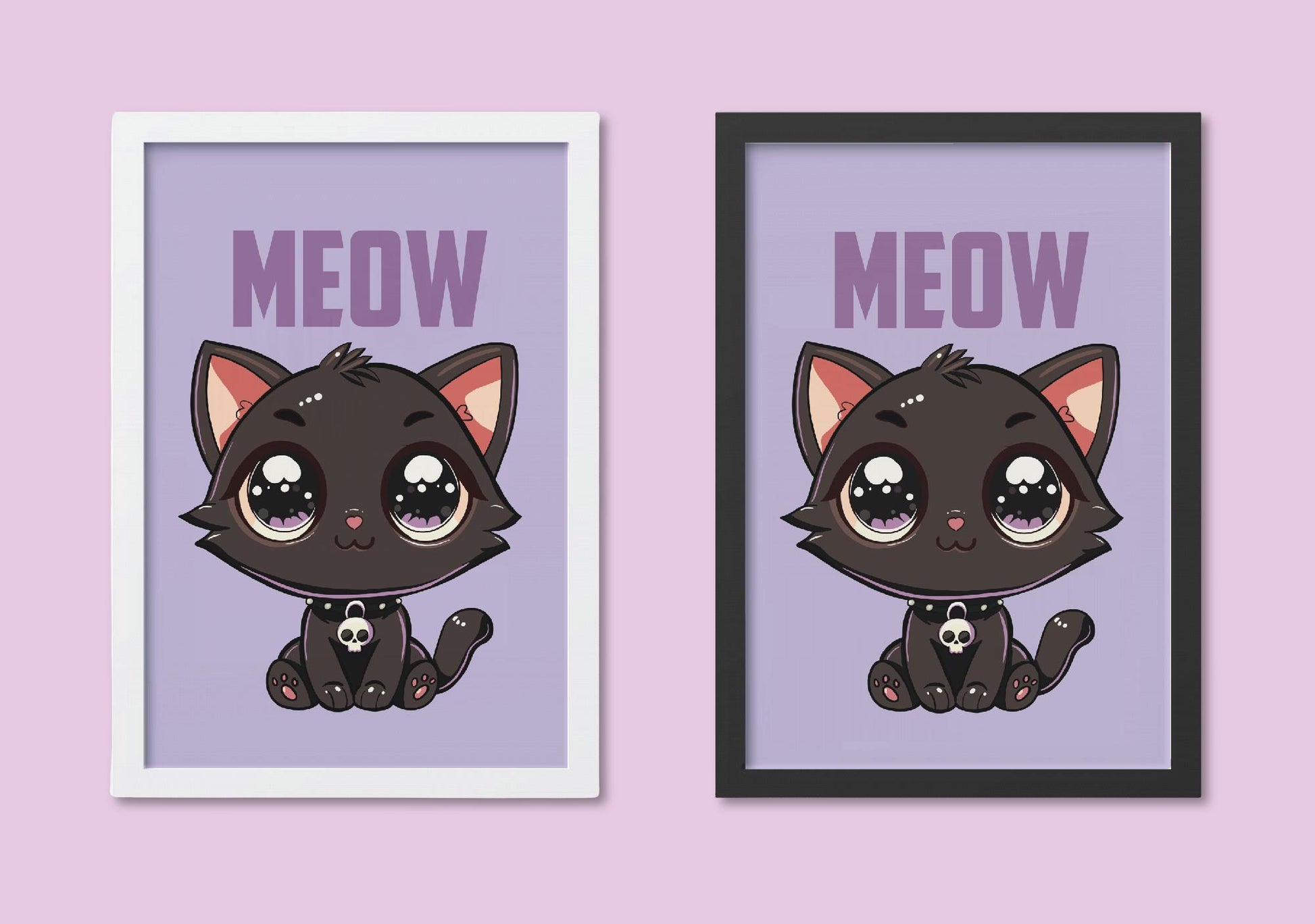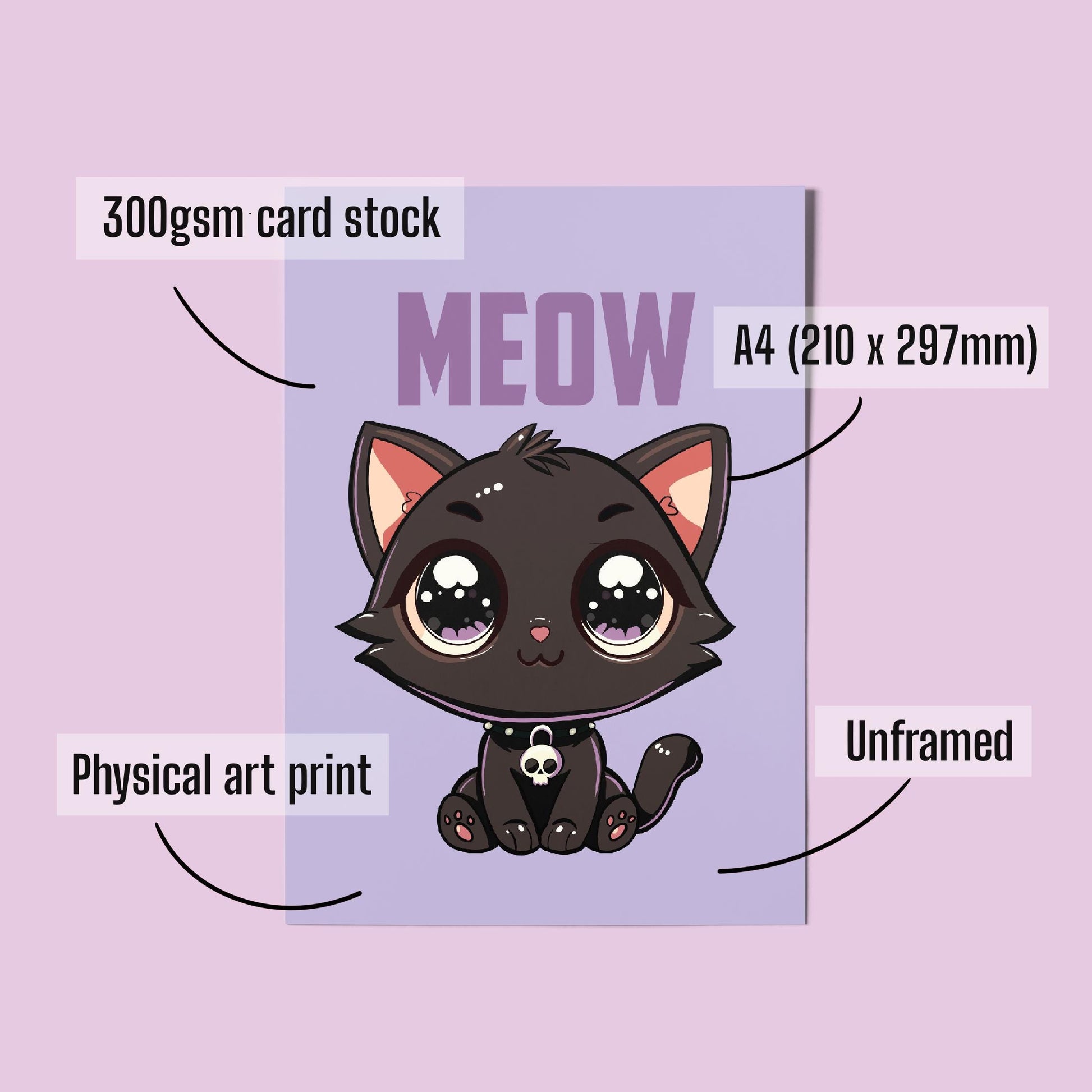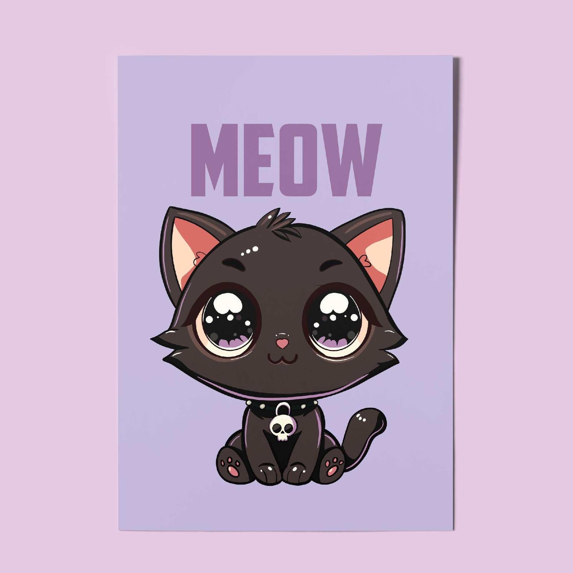 Bring a touch of adorably dark flair to your walls with this A4 art print featuring a wide-eyed black cat with a skull-adorned collar, set against a soft lavender background. The bold text "Meow" completes the design, blending playful kawaii vibes with an alternative edge that’s perfect for anyone who loves a mix of cute and spooky aesthetics. This print is ideal for fans of kawaii culture who lean toward an alt or goth style. Whether you’re decorating your bedroom, workspace, or gifting it to a friend who can’t resist cute cats with attitude, this design is a charming must-have.