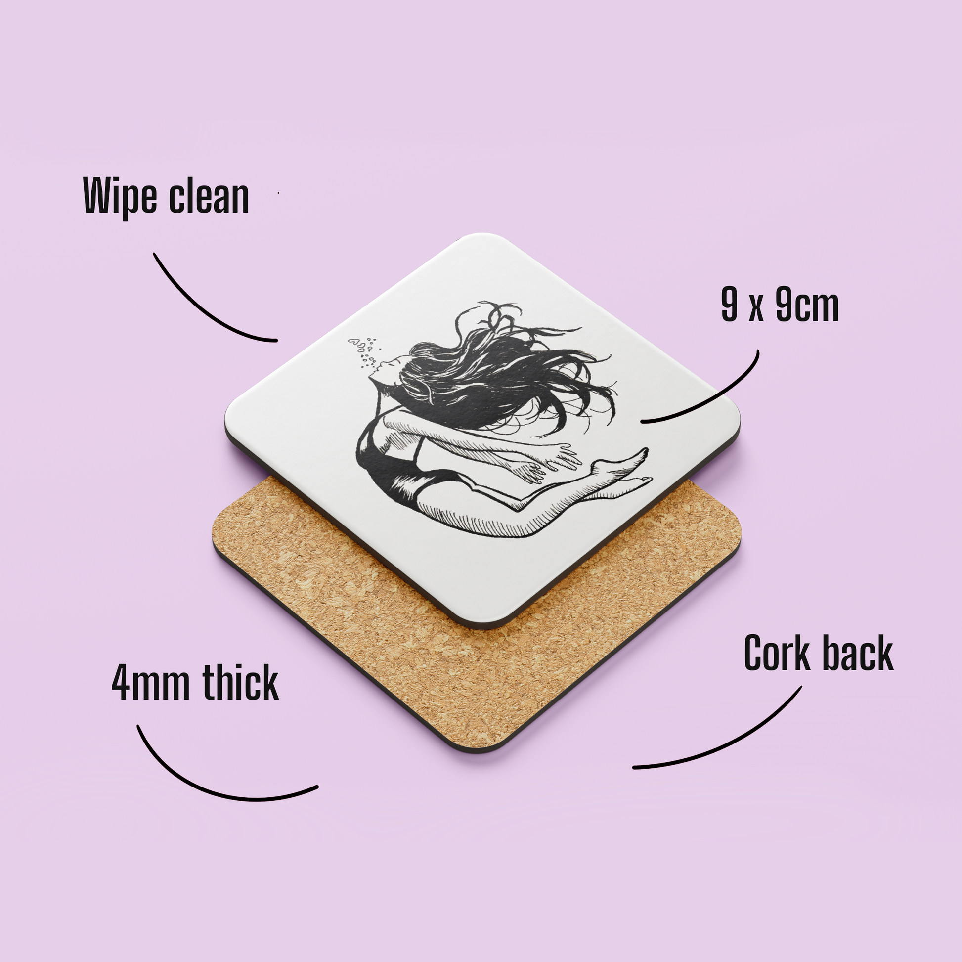Dreamy and surreal, this illustration evokes a sense of calm, reflection, and wonder. It’s a little pocket of magic for your coffee table – a place where stillness lives and imagination swims freely. Whether you see escape, introspection, or simply the beauty of breath in motion, this coaster invites you to pause for just a second longer.