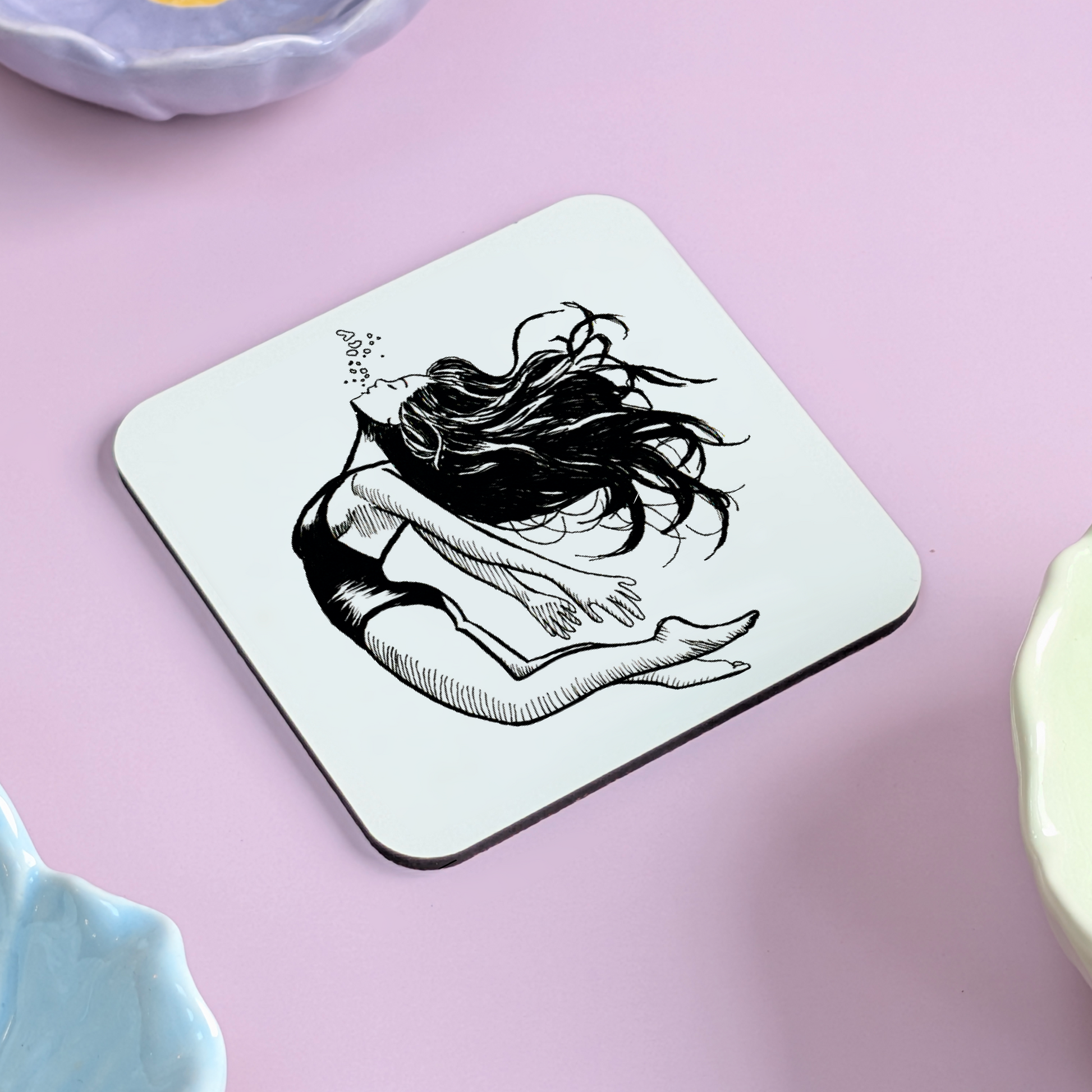 A quiet moment, suspended beneath the surface… This beautifully hand drawn coaster captures the delicate stillness of a girl underwater, eyes closed, with bubbles drifting gently from her lips. Her hair sways like seaweed in slow motion, wrapped in the kind of peaceful silence only found beneath the waves.