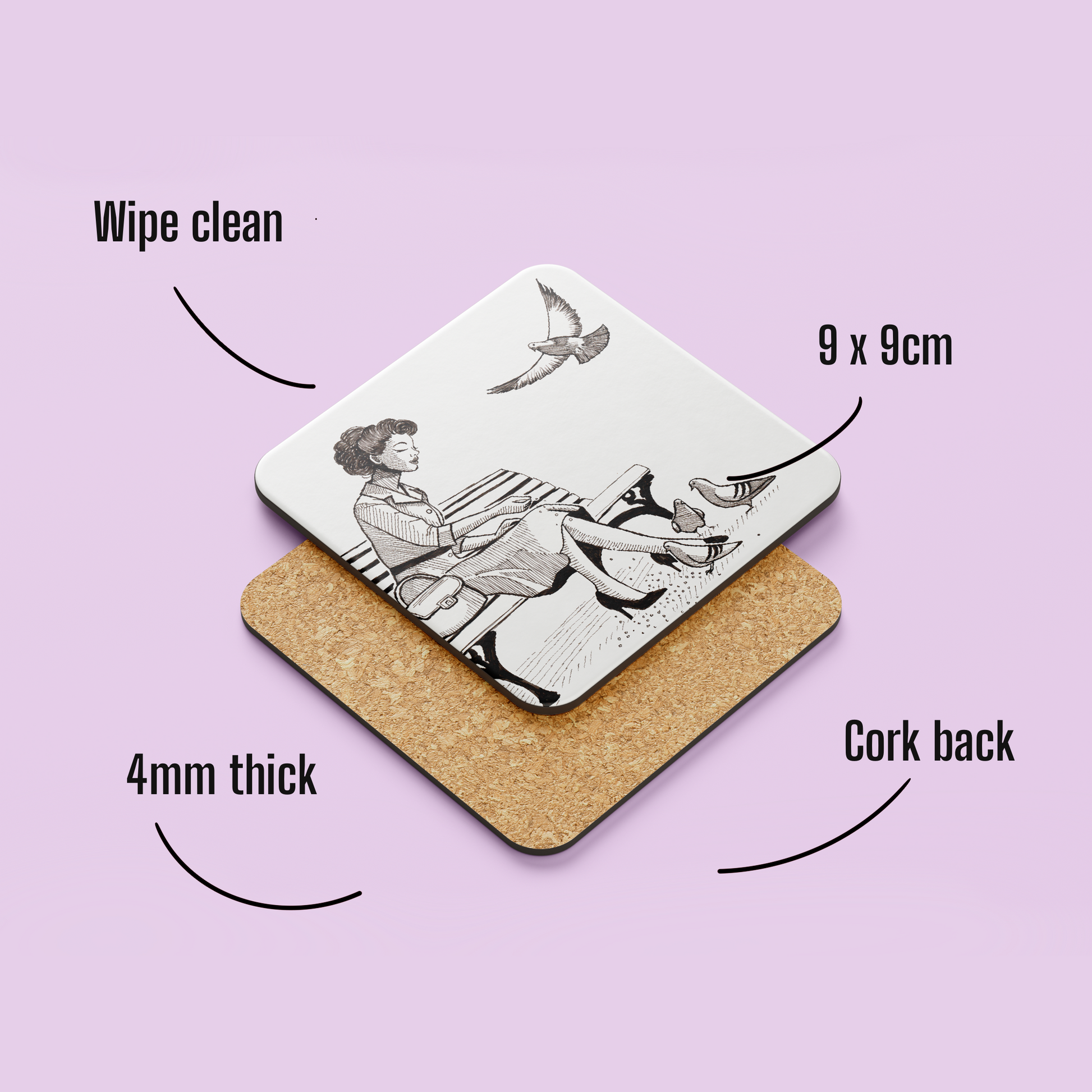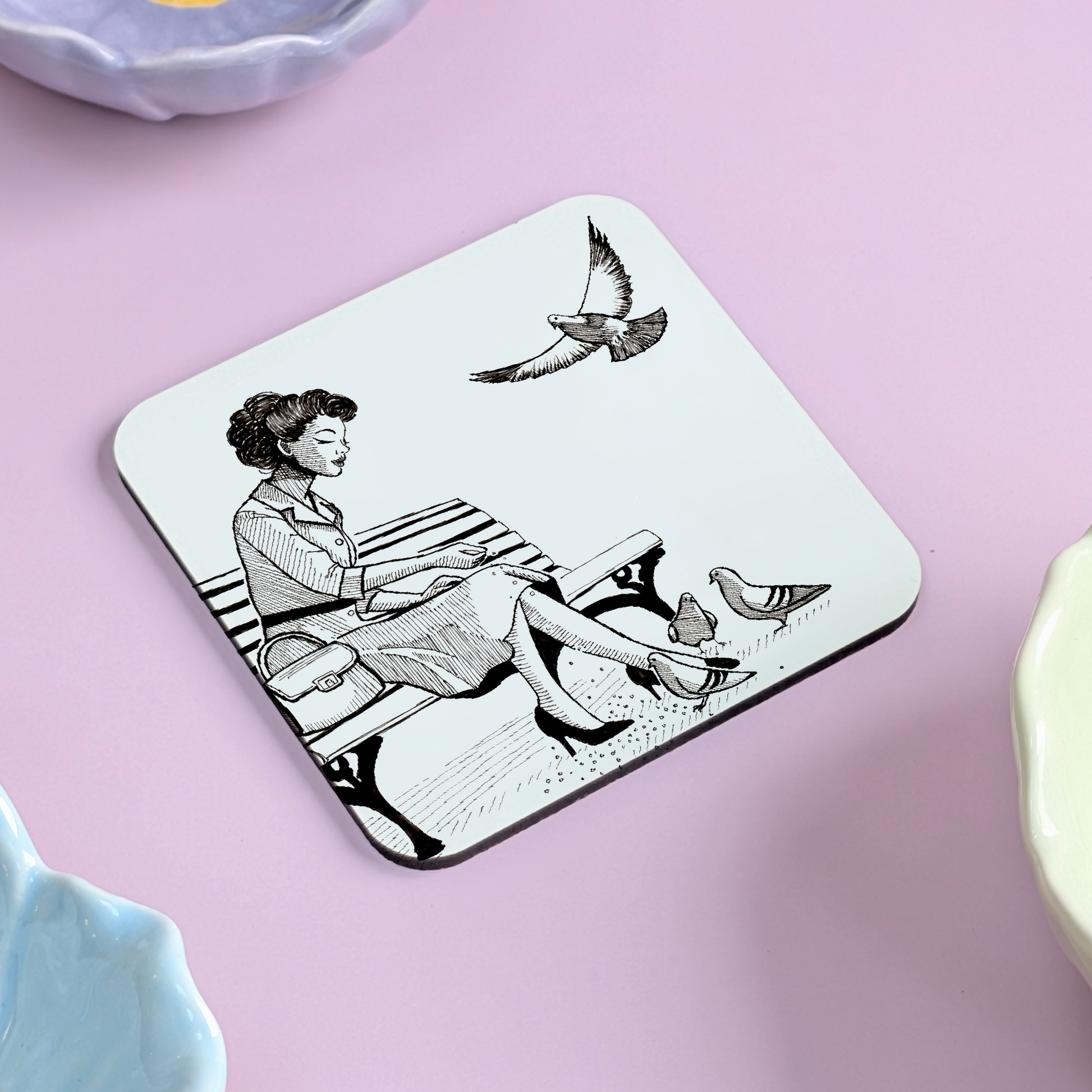 There’s a quiet kind of magic in feeding pigeons on a park bench, where the world slows down just long enough for breadcrumbs and daydreams to matter. This beautifully hand drawn coaster captures that moment of gentle rebellion and solitude: a stylish vintage-inspired woman, poised with grace, surrounded by the flutter of feathered companions and the hush of a city morning.