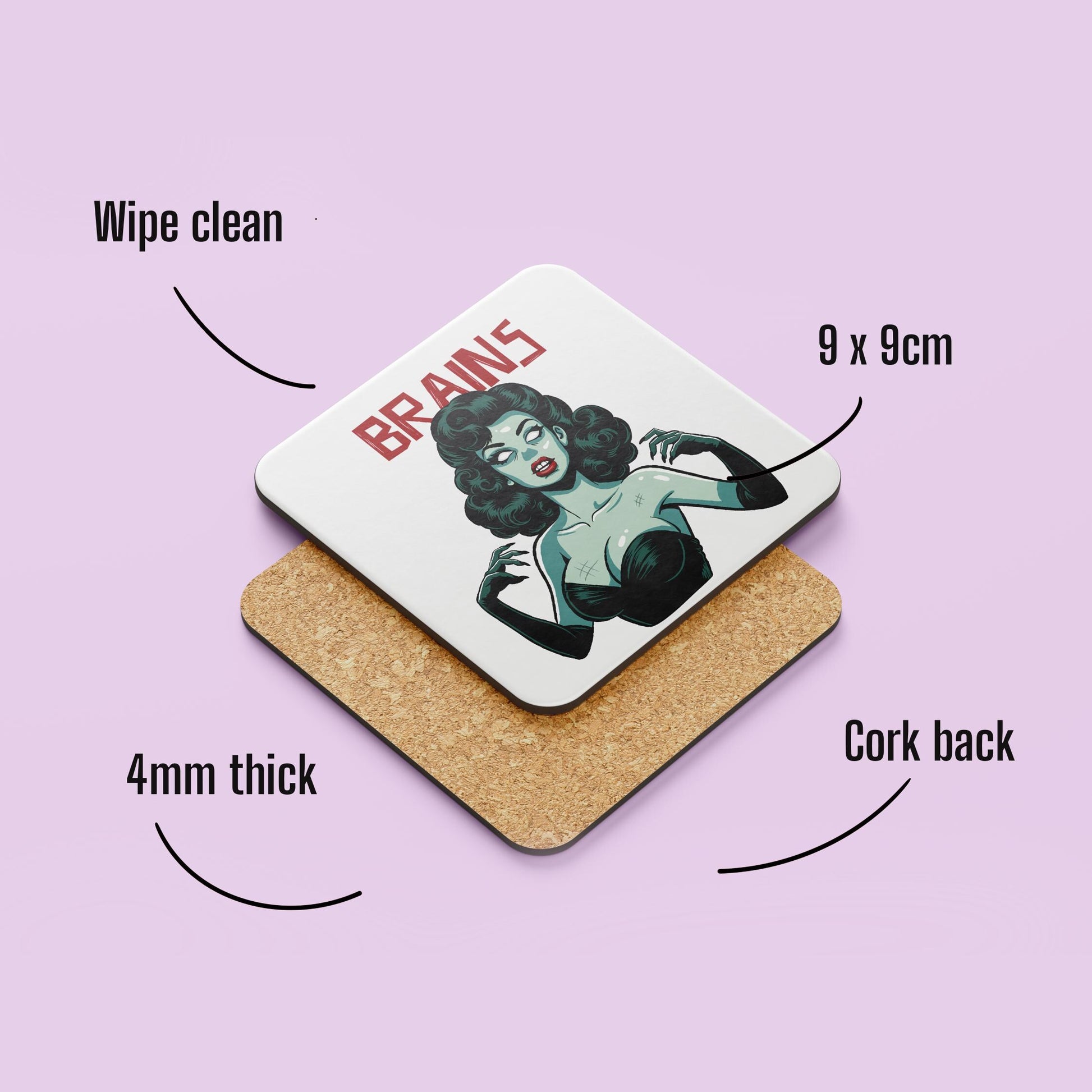 Buy 3 get 1 free across all coasters! Original illustration combining retro pinup glamour with spooky zombie charm Perfect for fans of vintage horror, alternative decor, and quirky accessories Protects your surfaces from heat, spills, and your coffee zombie tendencies Durable and easy to clean – practical and stylish A fun, unique gift for horror fans, pinup enthusiasts, or anyone who loves a little undead flair